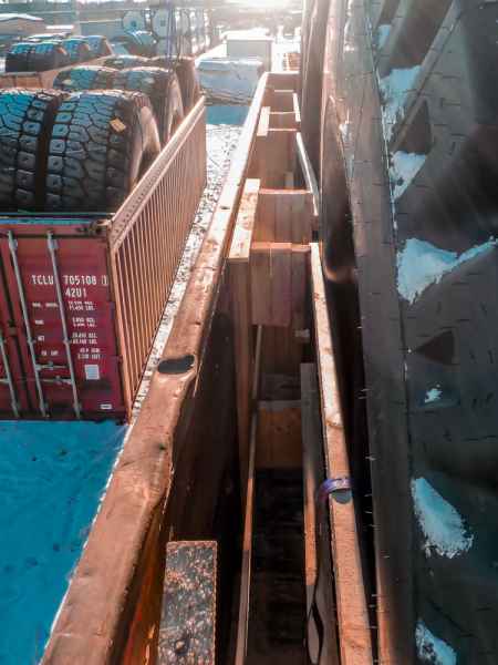 Oversize equipment securing on a railway gondola