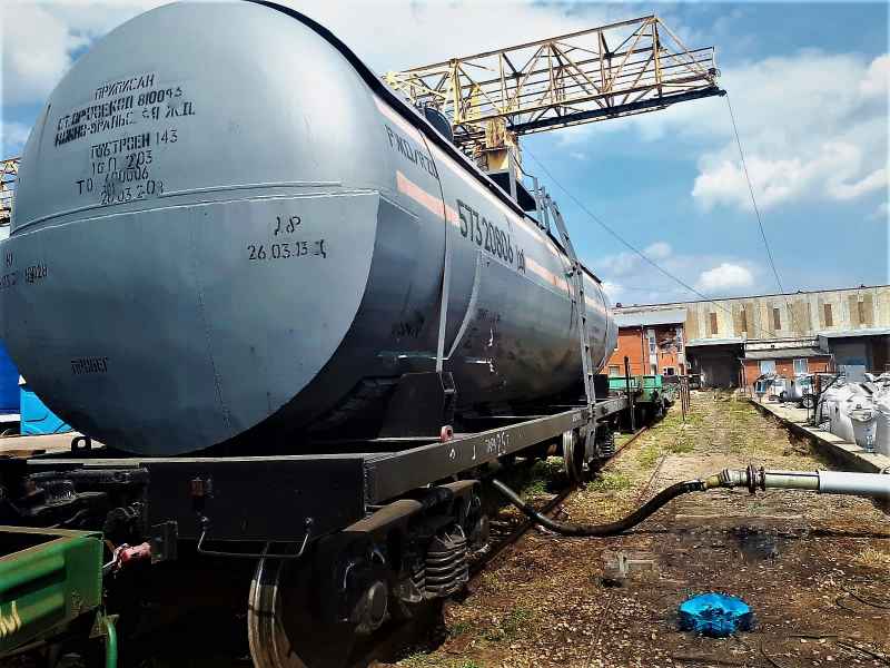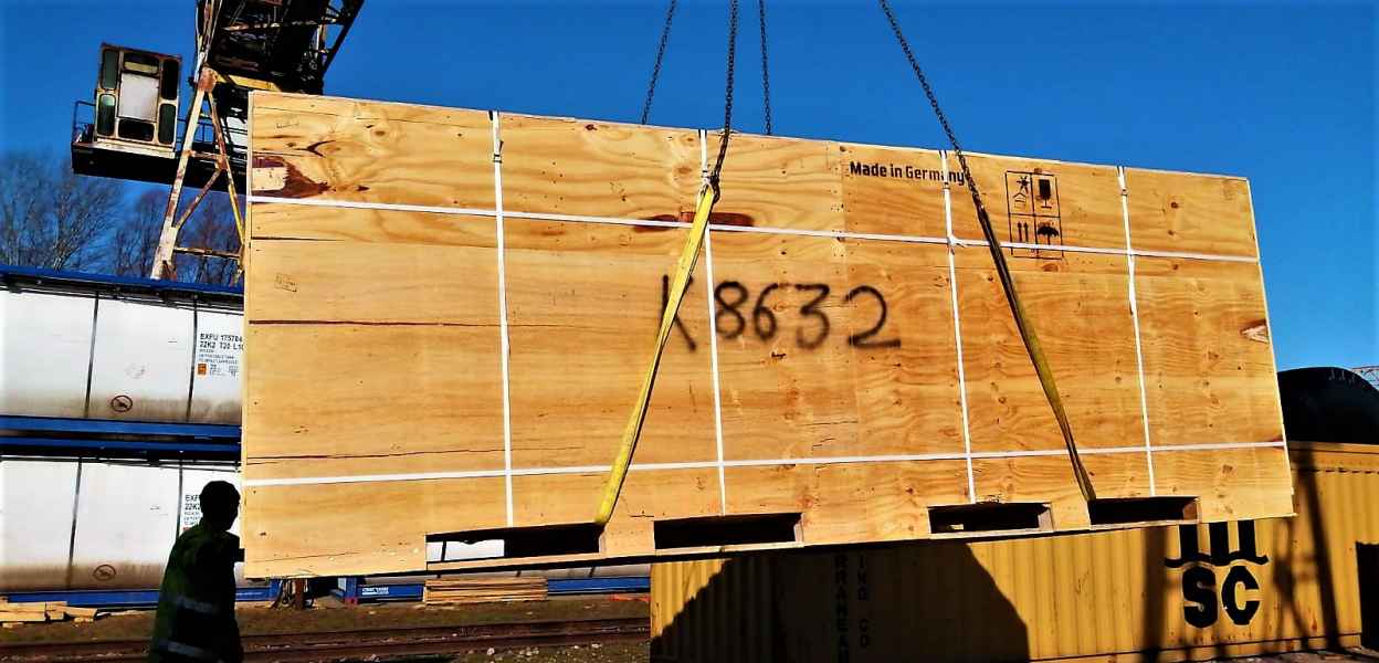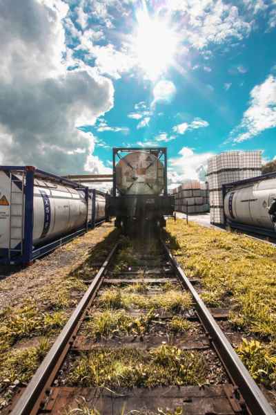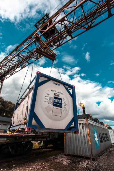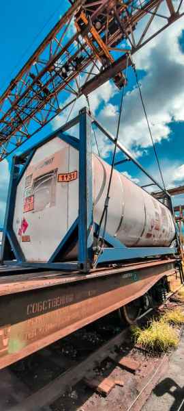 Tank-container loading onto a railway flat wagon
